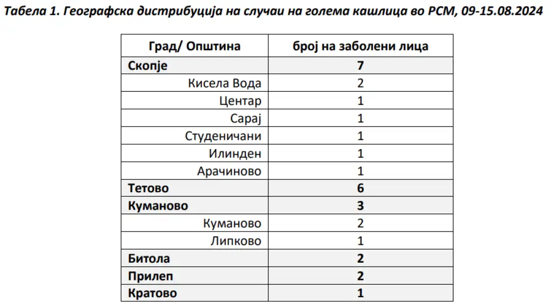 - Заклучно со 15 август, во Македонија се регистрирани вкупно 1.022 случаи на голема кашлица, со инциденца од 55,6/100.000 жители. Тоа претставува неколкукратно зголемување на бројот на заболени, во однос на изминатиот петгодишен период - 2019 - 2023 година, кога се регистрирани вкупно 10 случаи, пишува во извештајот на ИЈЗ.