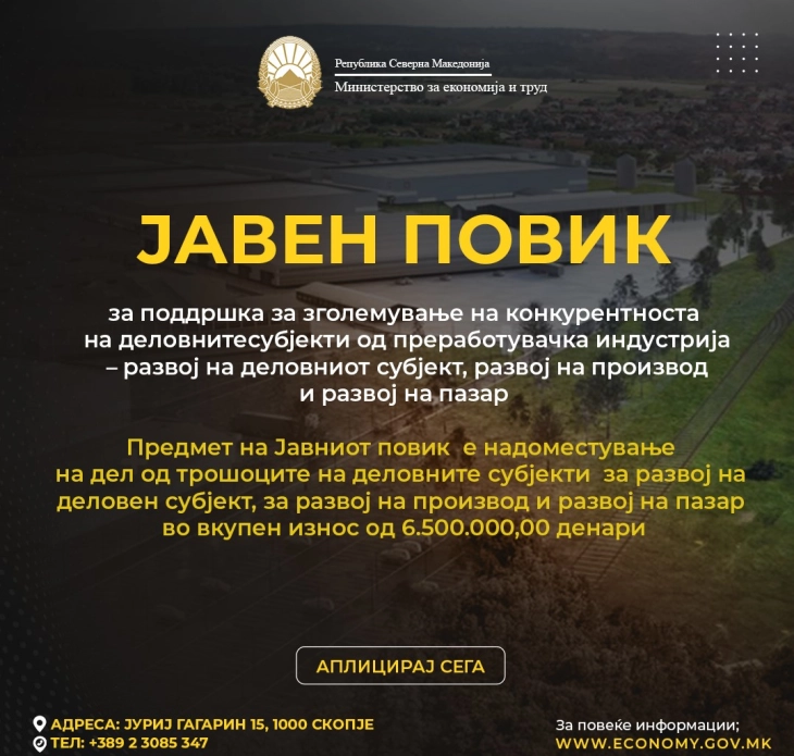 За јавниот повик за поддршка за зголемување на конкурентноста на деловните субјекти од преработувачка индустрија – развој на деловниот субјект, развој на производ и развој на пазар предвидени се 6.500.000 денари.