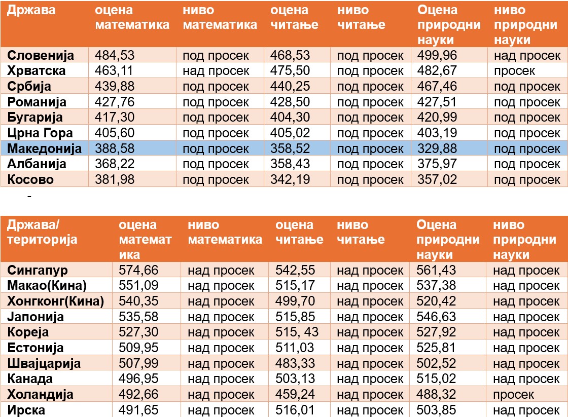 Оценки на државите на ПИСА тестирањето по математика, по читање и по природни науки според просекот на ОЕЦД (извор ОЕЦД)
