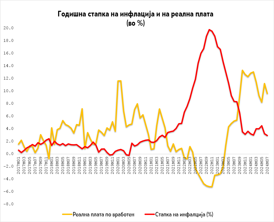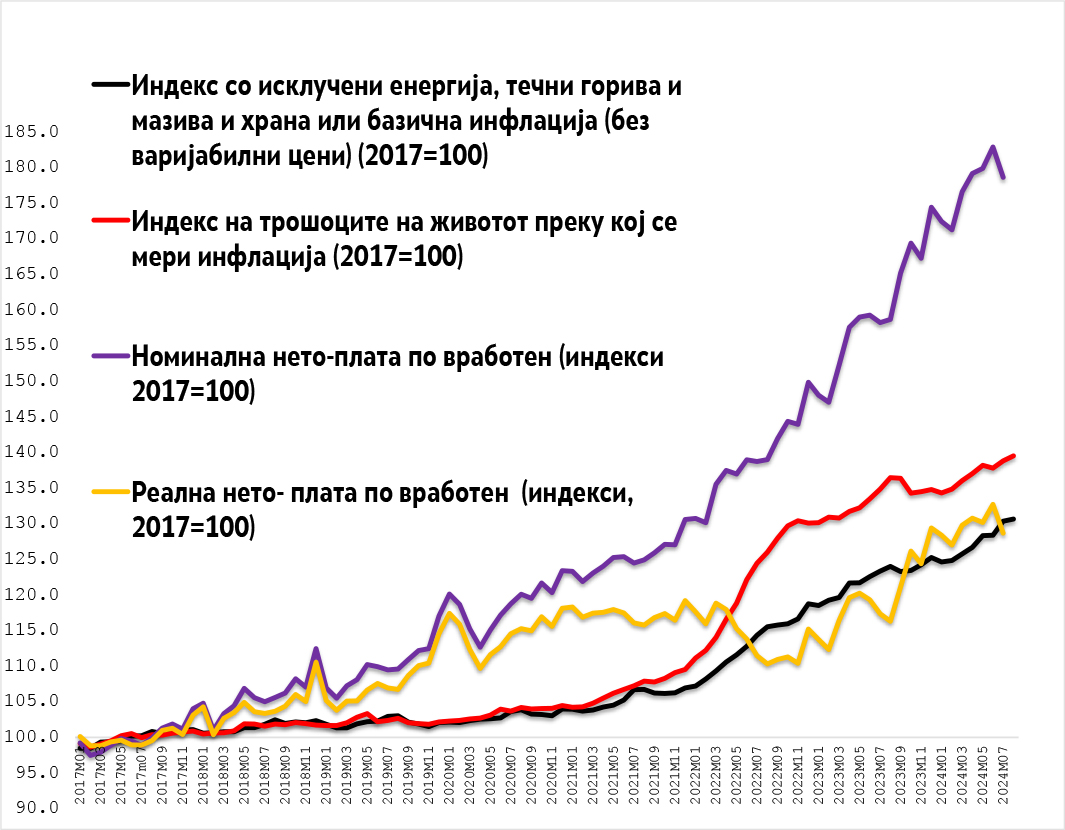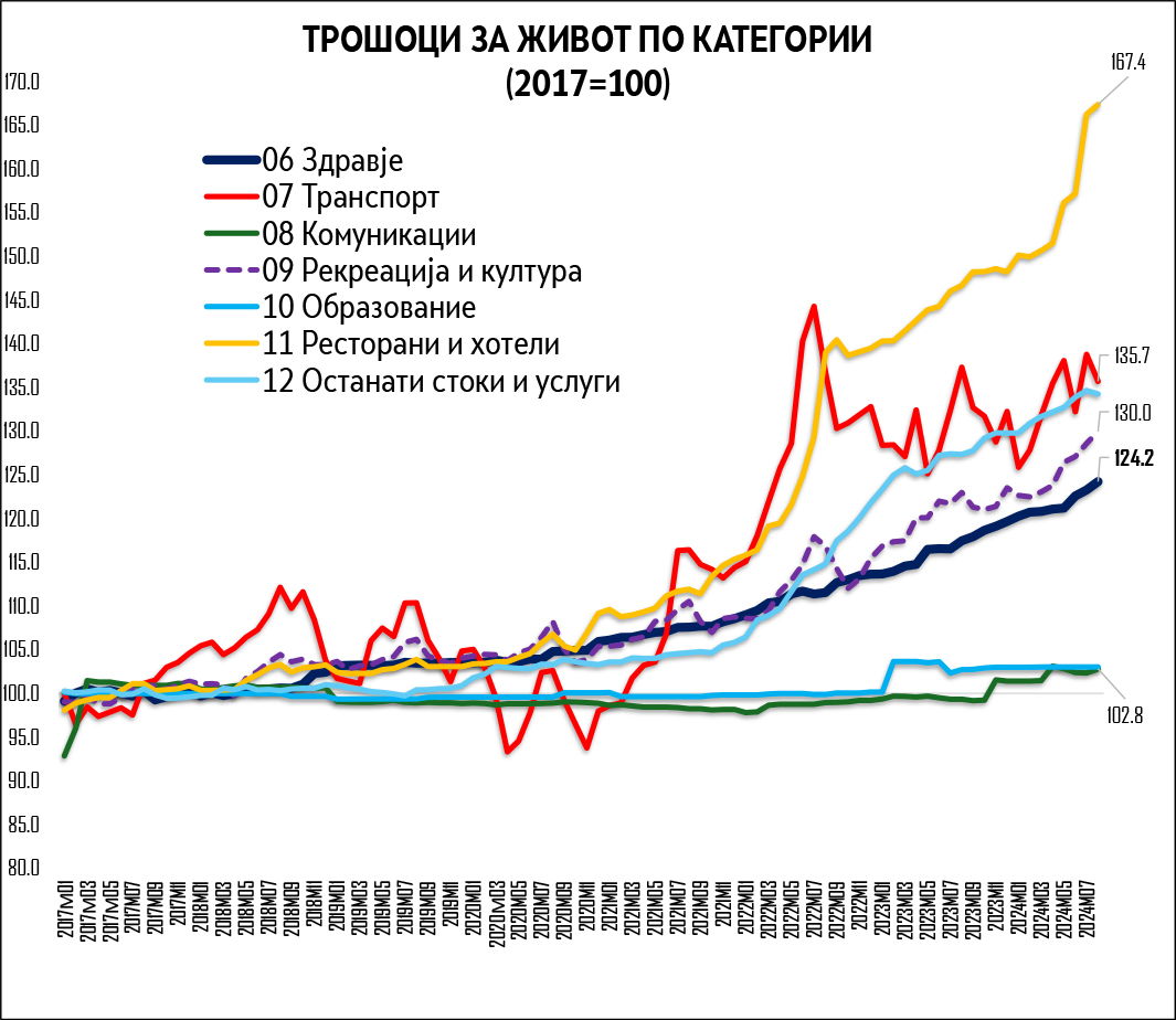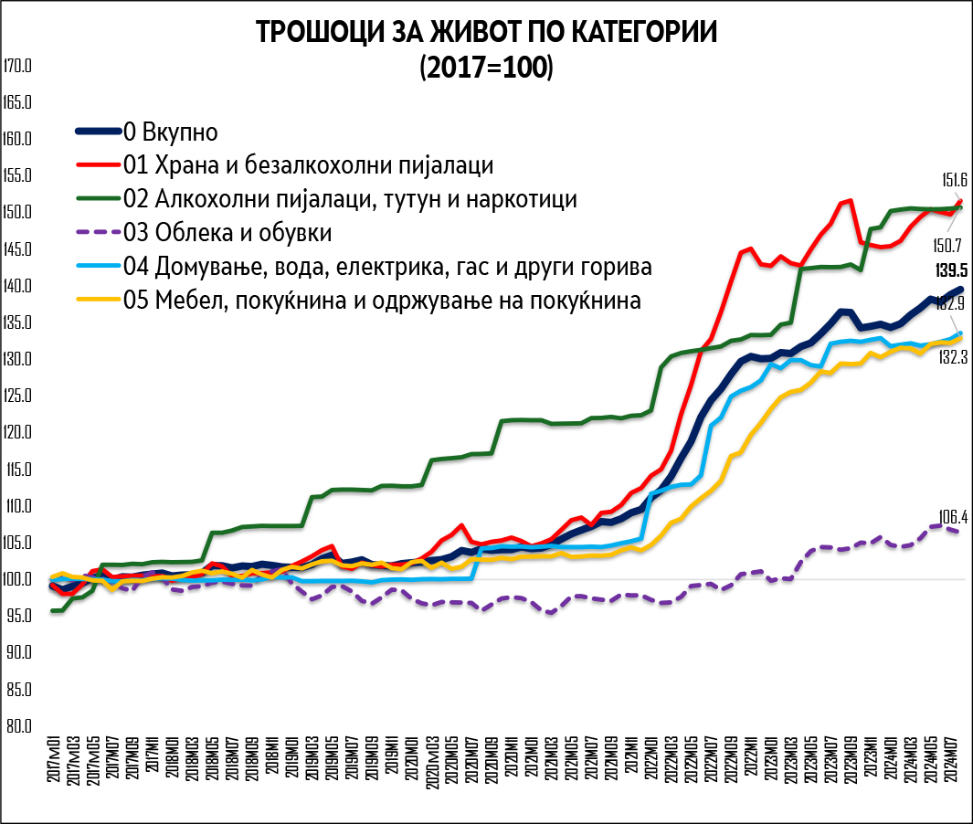 Севкупното ниво на трошоците на живот во август 2024 година е повисоко за 39,5 % од просечното ниво во 2017 година. Храната е поскапа за 51,6 % од просекот во 2017 година, а домувањето за 33,6 %. Имајќи предвид дека населението троши најголем дел од својот доход на овие две ставки, тогаш поскапениот живот уште повеќе се чувствува. Во последниве седум и пол години, висок раст имаа и трошоците на услугите во ресторани и во хотели, на алкохолни пијалаци и тутун, на мебел, на покуќнина и одржување на покуќнина, на транспортот, на рекреација и култура и за здравје. Во целиот период, малку се поскапени услугите и производите во комуникациите, образованието и облеката и обувките. Континуираниот и висок раст на цените започна од март 2021 година. Ако го земеме како база овој месец, тогаш трошоците за живот од март 2021 година до август 2024 година се зголемени за 33,2 %.