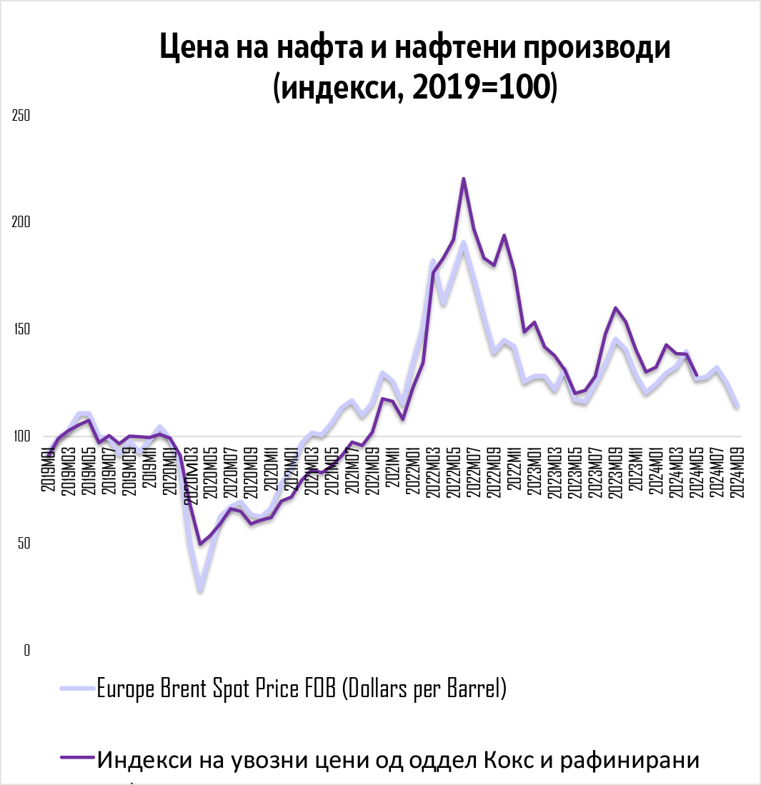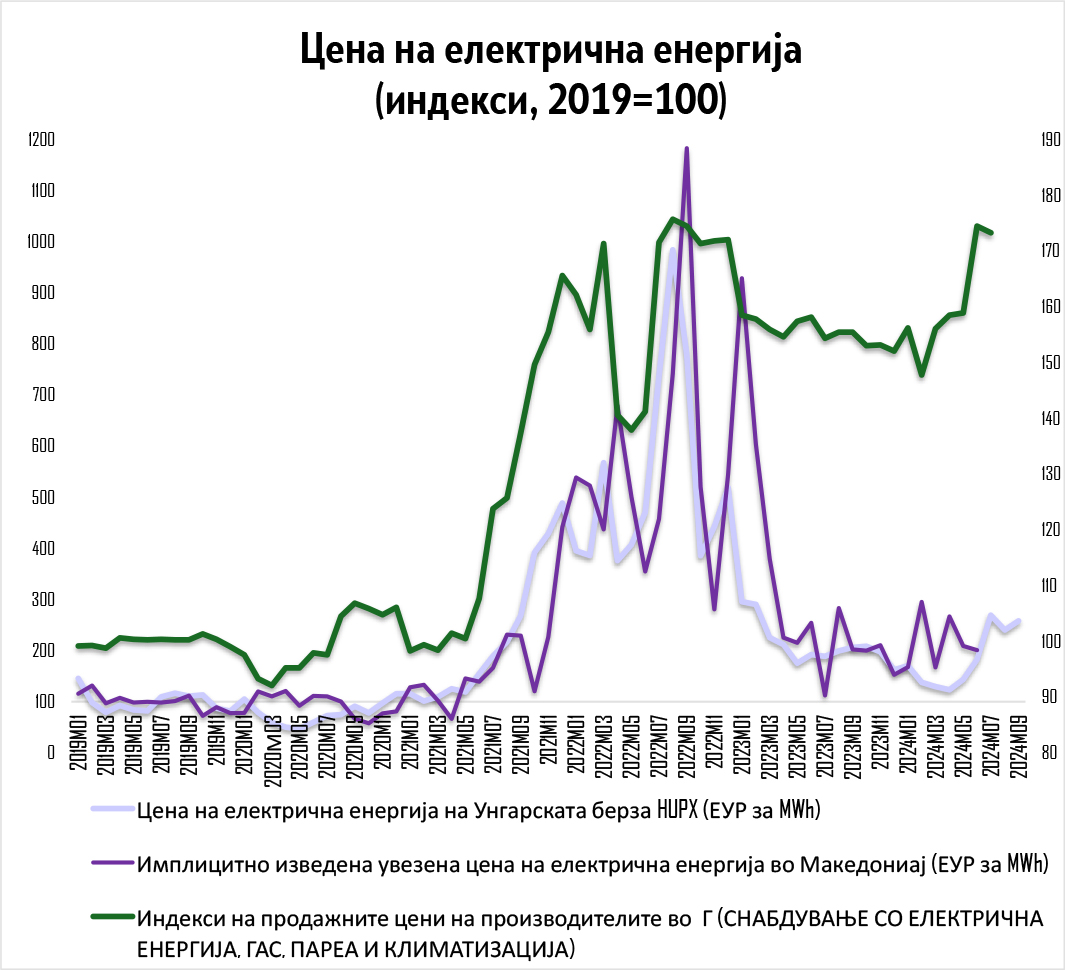 Последните движења наговестуваат зголемување на цената на електричната енергија на унгарската берза (од каде што најголем дел од трговците купуваат струја) и на намалување на цените на нафтените деривати поради намалување на цената на суровата нафта. Но, она што загрижува се високите продажни цени на домашните производители во дејноста Г или снабдување со електрична енергија, гас, пареа и климатизација. Тие не го следат трендот во светските цени, а се подигнати на значајно повисоко ниво од пред енергетската криза. Причините лежат во познати, но и во непознати фактори кои треба да се идентификуваат. Познатите причини се долгогодишната запоставена производствена инфраструктура, нерационалното користење на водните ресурси и спората зелена транзиција за поевтино производство на електрична енергија. Непознатите причини може лежат во фактот на скапи суровини за производство на електрична енергија набавени и увезени во претходниот период или поради други за мене непознати фактори. Решавањето на проблемот на ниското домашно производство на електрична енергија од страна на државата долгорочно ќе влијае за намалување на инфлацијата. Но, радува фактот што приватниот сектор реагираше брзо за намалување на сопствените трошоци за електрична енергија. Енергетската криза принуди голем дел од приватниот сектор да инвестира и да пристапи кон зелената транзиција, што придонесе кон намалување на трошоците за производство (или кај домаќинствата на трошоците за домување).