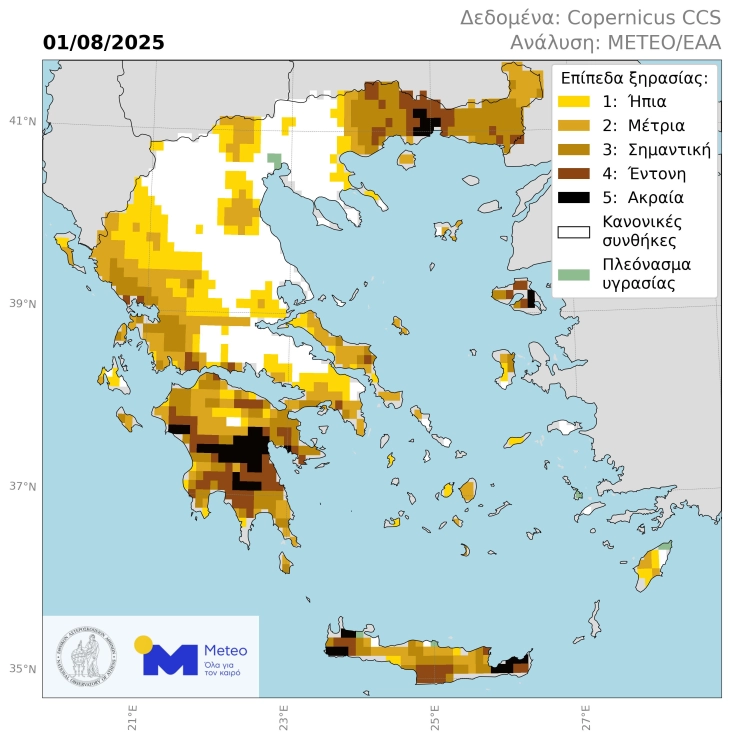 Според податоците за влажноста на почвата од Коперник на Европската Унија, голем дел од Крит, Пелопонез, источниот дел на областа Македонија, Тракија и Лезбос се погодени од интензивна или екстремна суша (нивоа четири и пет).