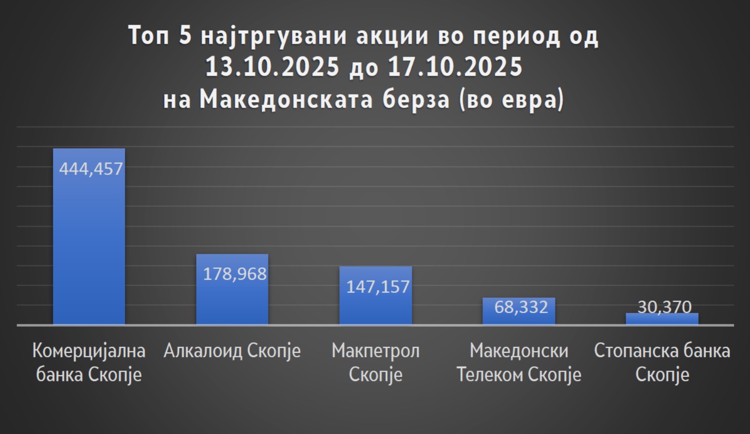 Минатата недела, во периодот од 13.10.2025 – 17.10.2025г година на Македонската берза на хартии од вредност на официјалниот пазар (акции и обрврзници) беше остварен вкупен промет од 59,1 милиони денари или околу 962,2 илјади евра. Овој промет беше реализиран преку 289 трансакции преку кои се истргуваа вкупно 16 600 акции и 370 обврзници.