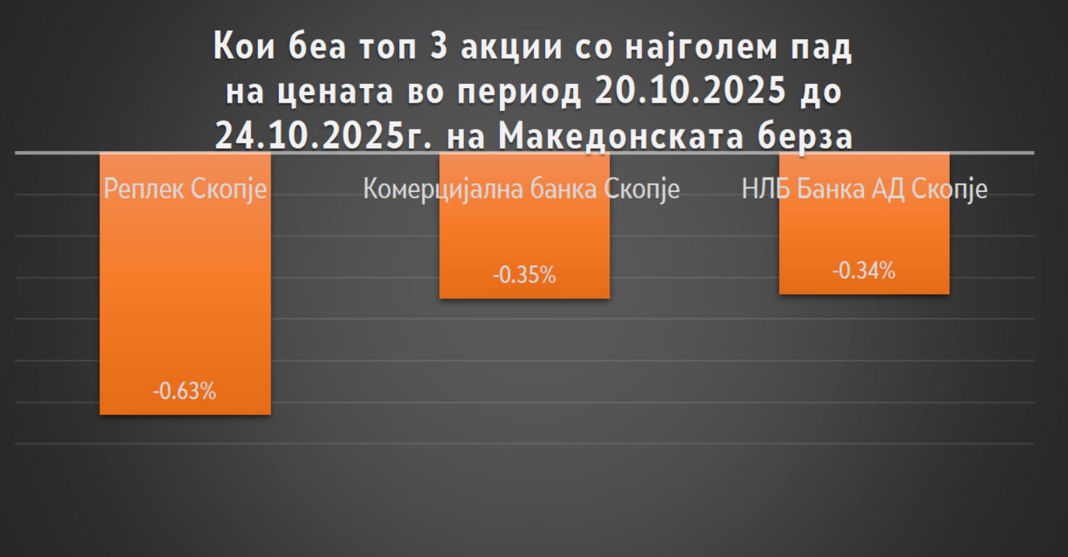 Намалување на вредноста изминатата недела бележиме кај акциите на Реплек Скопје, Комерцијална банка Скопје и НЛБ Банка АД Скопје. Цената на нивните акции се намали за 0,63 %, 0,35 % и 0,34 %, соодветно.