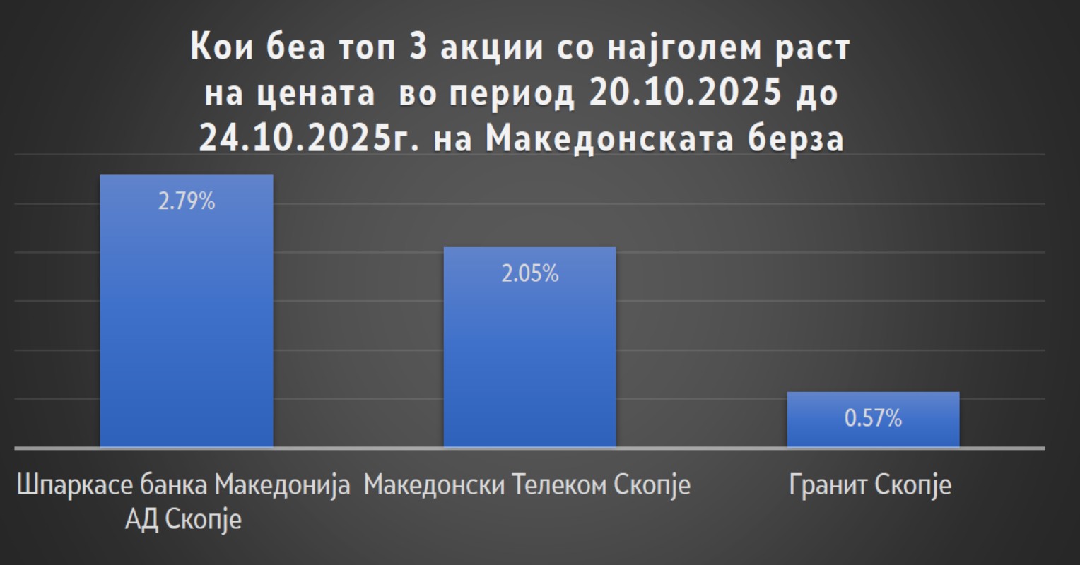 Минатата недела, во периодот од 20.10.2025 – 24.10.2025 година на Македонската берза на хартии од вредност на официјалниот и на редовниот пазар беше остварен вкупен промет од 85,3 милиони денари или околу 1,38 милиони евра. Најголем промет од 46,7 милиони денари или 760,3 илјади евра беше реализиран преку акциите на Гранит Скопје (54,7 % од вкупниот промет). Втори најтргувани акции беа акциите на Комерцијална банка Скопје со 23,1 милиони денари или околу 375,7 илјади евра (27 % од вкупниот промет). Потоа следуваа акциите на Макпетрол Скопје со 2,37 милиони денари или околу 38,5 илјади евра (2,7 % од вкупниот промет). Во топ 5 акции според прометот изминатата недела беа уште и акции на НЛБ Банка АД Скопје со 2,3 милиони денари или околу 37,4 илјади евра и акциите на Витаминка Прилеп со промет од 1,65 милиони денари или 26,8 илјади евра.