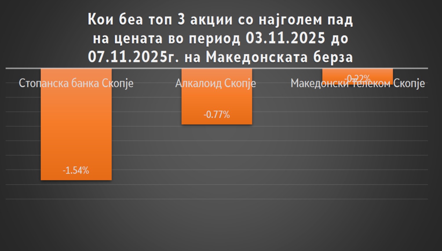 Минатата недела, во периодот од 03.11.2025 – 07.11.2025 година на Македонската берза на хартии од вредност вкупно на сите пазари (официјален и редовен пазар) беше остварен вкупен промет од 98,4 милиони денари или околу 1,6 милиони евра. Во однос на неделата пред оваа, ова е зголемување за 25,9 %. Најголем промет од 32,8 милиони денари или 534,3 илјади евра беше реализиран преку акциите на Комерцијална банка Скопје (33,3 % од вкупниот промет). Втори најтргувани акции беа акциите на Алкалоид Скопје со 23,1 милиони денари или околу 375,8 илјади евра (23,7 % од вкупниот промет). Потоа следуваа акциите на НЛБ Банка АД Скопје со 12,2 милиони денари или околу 198,5 илјади евра (12,3 % од вкупниот промет). Првата петорка за изминатава недела се заокружува со акциите на Гранит Скопје со 9,2 милиони денари или околу 150,5 илјади евра и со акциите на Макпетрол со промет од 6,8 милиони денари или 111,7 илјади евра.