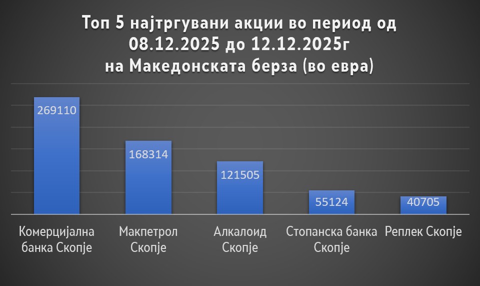 Минатата недела, во периодот од 08.12.2025 – 12.12.2025г година на Македонската берза на хартии од вредност на официјалниот пазар (акции и обрврзници) беше остварен вкупен промет од 46,9 милиони денари или околу 763,1 илјади евра. Овој промет беше реализиран преку 237 трансакции преку кои се истргуваа вкупно 9 963 акции и 21 479 обврзници.