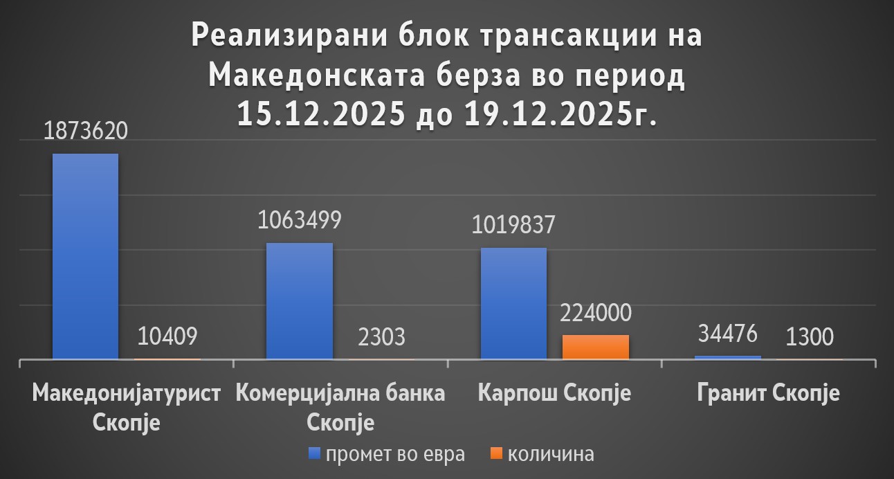 Минатава неделанаМакедонската берза (15.12.2025 – 19.12.2025г) тргувањето помина во „знакот“ на блок трансакциите. Имено, се реализираше една блок трансакција во износ од 1,87 милиони евра со акциите на Македонијатурист Скопје преку која се истргуваа вкупно 11 070 акции. Во втора блок трансакција се истргуваа вкупно 2 303 акции на Комерцијална банка за 1,06 милиони евра. Со трета блок трансакција се истргуваа вкупно 224 000 акции на компанијата Карпош Скопје за 1,01 милиони евра. Со последната блок трансакција за 34,4 илјади евра се истргуваа вкупно 1 300 акции на Гранит Скопје. Според ова минатата недела во 4 блок трансакции се истргуваа скоро 4 милиони евра.