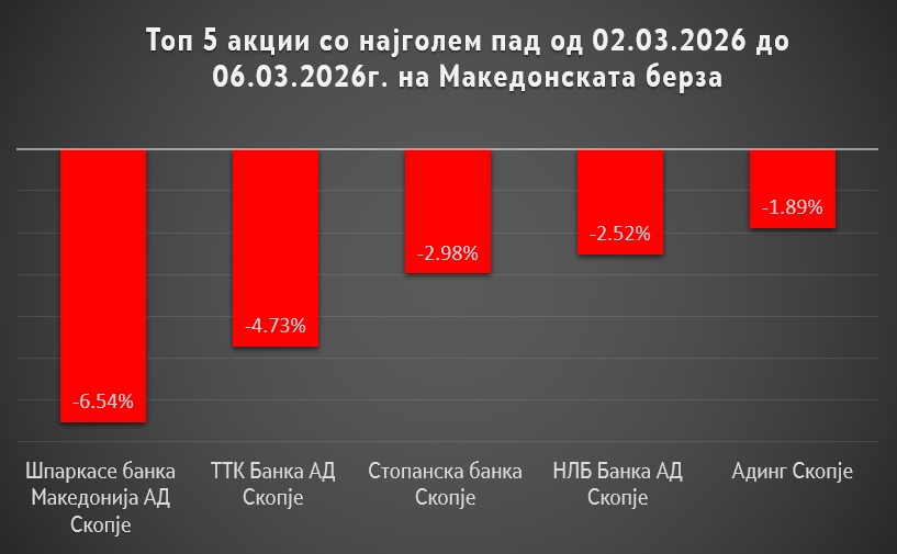Најголемо пак намалување на вредноста имале акциите од банкарскиот сектор и тоа: Шпаркасе банка Македонија АД Скопје од 6,54 %, ТТК Банка АД Скопје од 4,73% , Стопанска банка Скопје од 2,98 % и НЛБ Банка АД Скопје од 2,52 %.