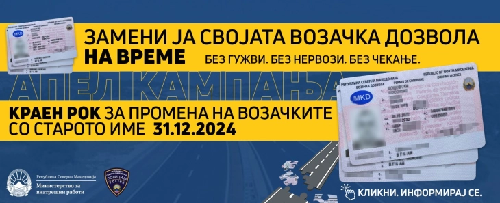 Министерството за внатрешни работи ги потсетува граѓаните дека важноста на возачките дозволи со старото уставно име, согласно со промената на законот за безбедност во сообраќајот, е заклучно со 31.12.2024 година.