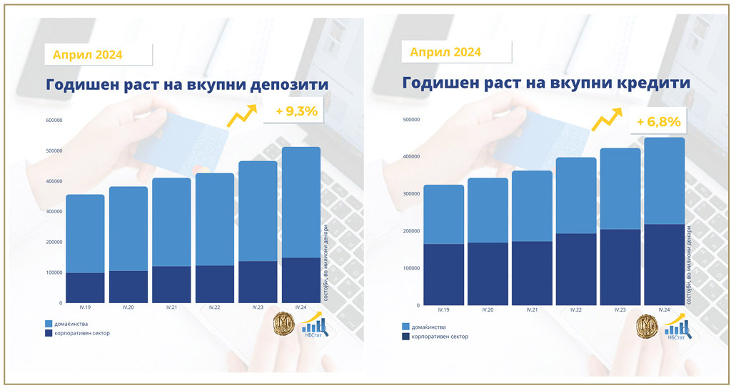 Анализирано на годишно ниво, вкупните депозити се зголемени за 9,3%, поради повисоките депозити на двата сектора, со поизразен придонес на депозитите на секторот „домаќинства“.
