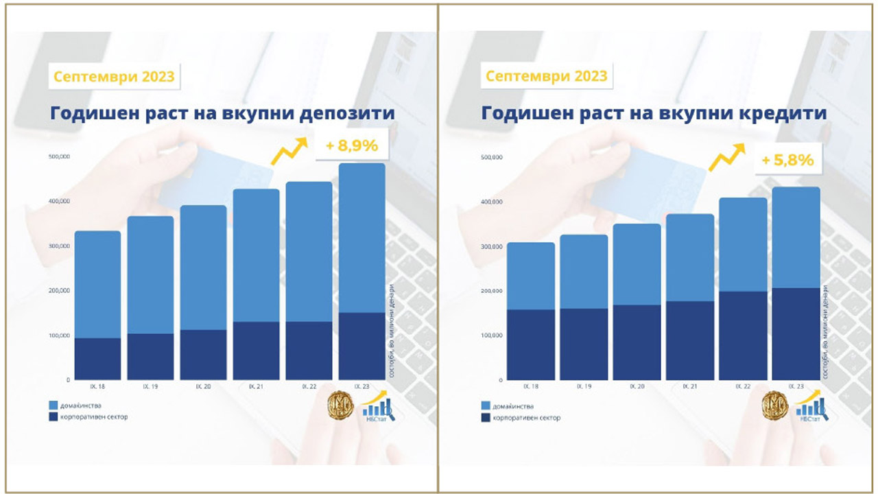 Анализирано на годишно ниво, вкупните депозити се зголемени за 8,9%, како резултат на зголемувањето на депозитите на двата сектора, со малку поголем придонес на секторот домаќинства.