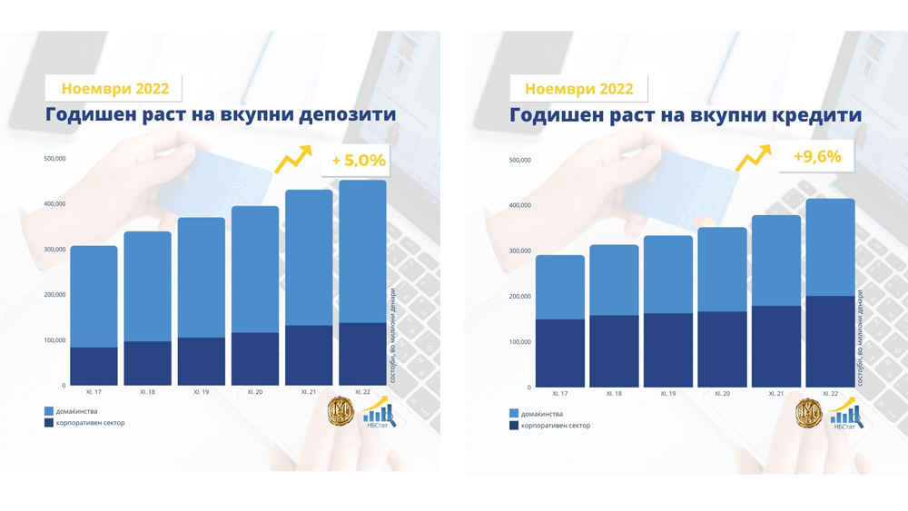 Годишен раст од 5,0% на вкупните депозити и од 9,6% на вкупната кредитна поддршка во ноември 2022 година.