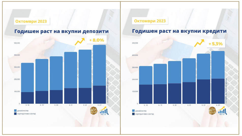Анализирано на годишно ниво, вкупните депозити се зголемени за 8,0%, како резултат на повисоките депозити на двата сектора, со поизразен придонес на секторот домаќинства.