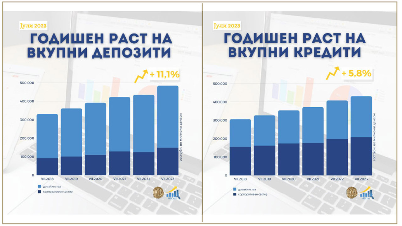 Анализирано на годишно ниво, вкупните депозити се зголемени за 11,1%, што произлегува од зголемувањето на депозитите на двата сектора, со малку поизразен придонес на секторот „домаќинства“.