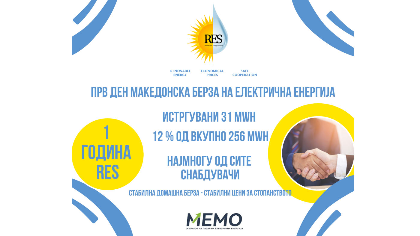 Компанијата РЕС (Renewable Energy Supply), вчера, на првиот ден од работењето на македонската берза за електрична енергија, истргува најголемо количество енергија од сите снабдувачи, односно 31 мегават часови, или 12% од вкупното количество од 256 мегават часови, истргувани од страна на 20 компании...