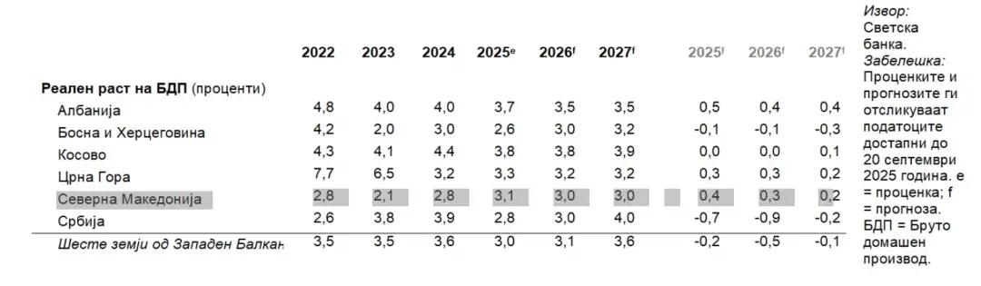 Реален раст на БДП од 3,1 отсто во 2025 година, од 3 проценти во 2026-та и од 3 отсто во 2027 година се проценките на Светска банка за земјава. Според последниот извештај, разликата во процентни поени од проекциите во пролетниот извештај за 2025 година е во нагорна линија и изнесува 0,4, 0,3 и 0,2 з...