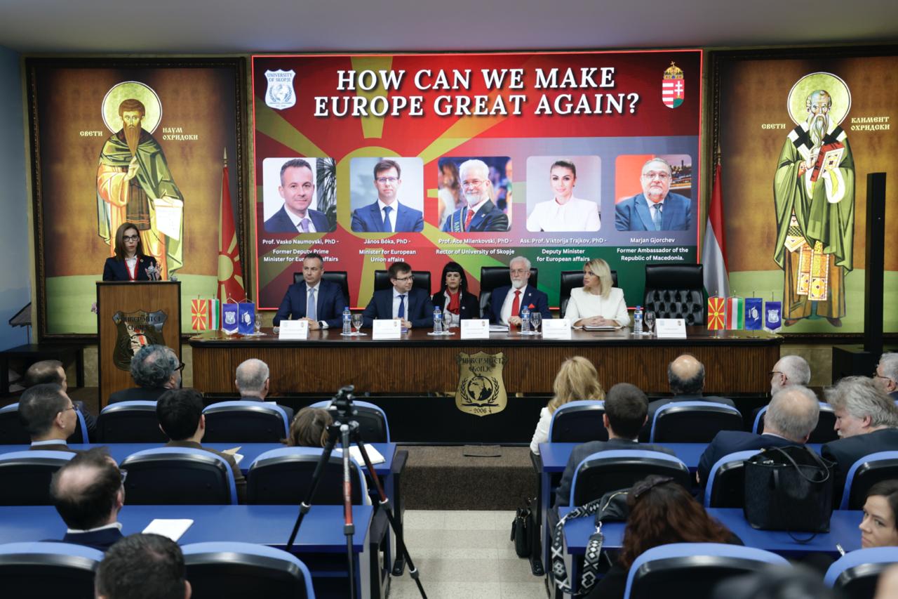 Како да ја направиме ЕУ повторно силна кога се соочува со низа предизвици како на безбедносен, така и на економски план? На оваа тема на Универзитетот Скопје, дебатираа амбасадори, министри и професори, во присуство на почесниот гостин министерот за европски прашања на Унгарија, Јанош Бока кој одржа...